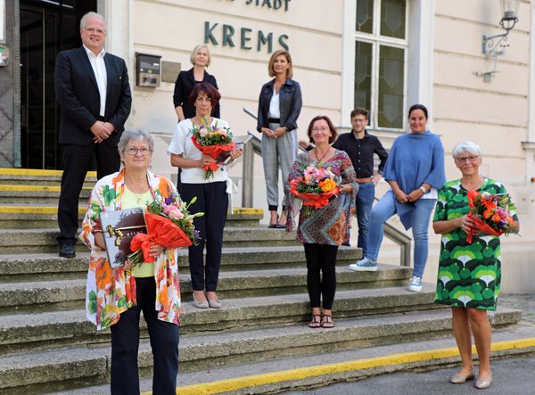 Ulrike Haydu und Sabine Laz vom museumkrems sichten die Erinnerungsstücke aus dem Kindergarten Altstadt.