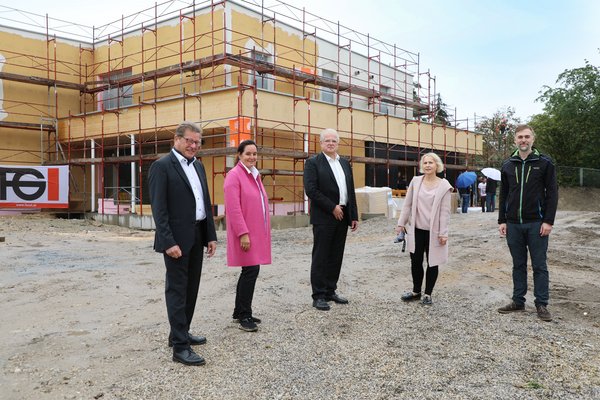 Lokalaugenschein auf dem neuen Spielplatz in Egelsee: Wirtschaftshof-Leiter Jürgen Stundner, die Stadtgärtner Patrick Strobl, Markus Edlinger und Paul Mistelbauer, Stadtrat Werner Stöberl und Bereichsleiter Mag. Roland Dewisch (von links) mit Emil und seiner Mutter
