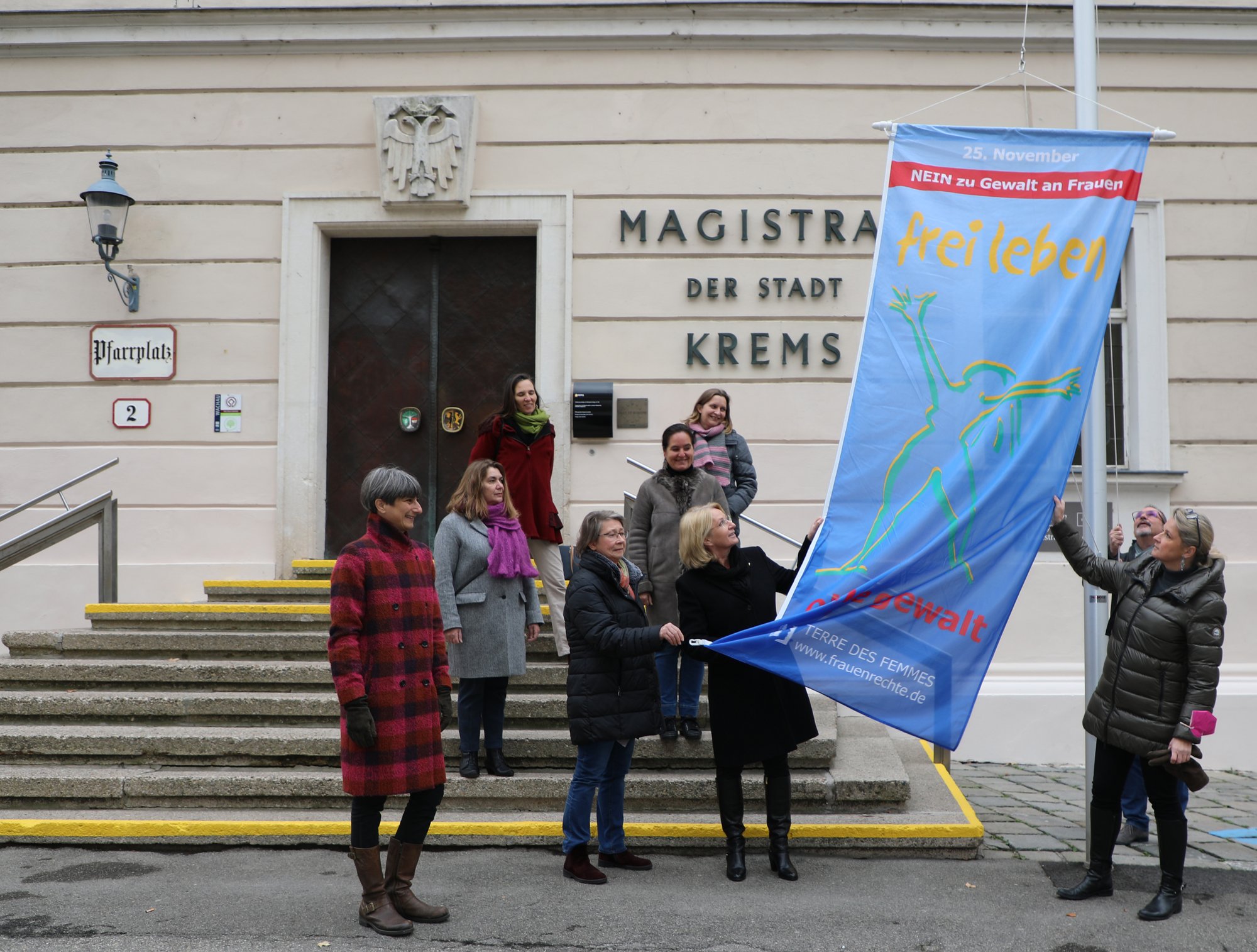 Vor dem Kremser Rathaus wird gemeinsam mit der Frauenberatung Lilith die Fahne „Frei leben ohne Gewalt“ gehisst. Bis 10. Dezember werden darüber hinaus das Steiner Tor, der Stadtpark-Pavillon, die Gozzoburg und die Dreifaltigkeitssäule in orangefarbenem Licht erstrahlen. „Unser Ziel ist es, Ausmaß und die unterschiedlichen Ausprägungen von Gewalt gegen Frauen zu thematisieren und Bewusstsein dafür zu schaffen“, sagt Vizebürgermeisterin Eva Hollerer.