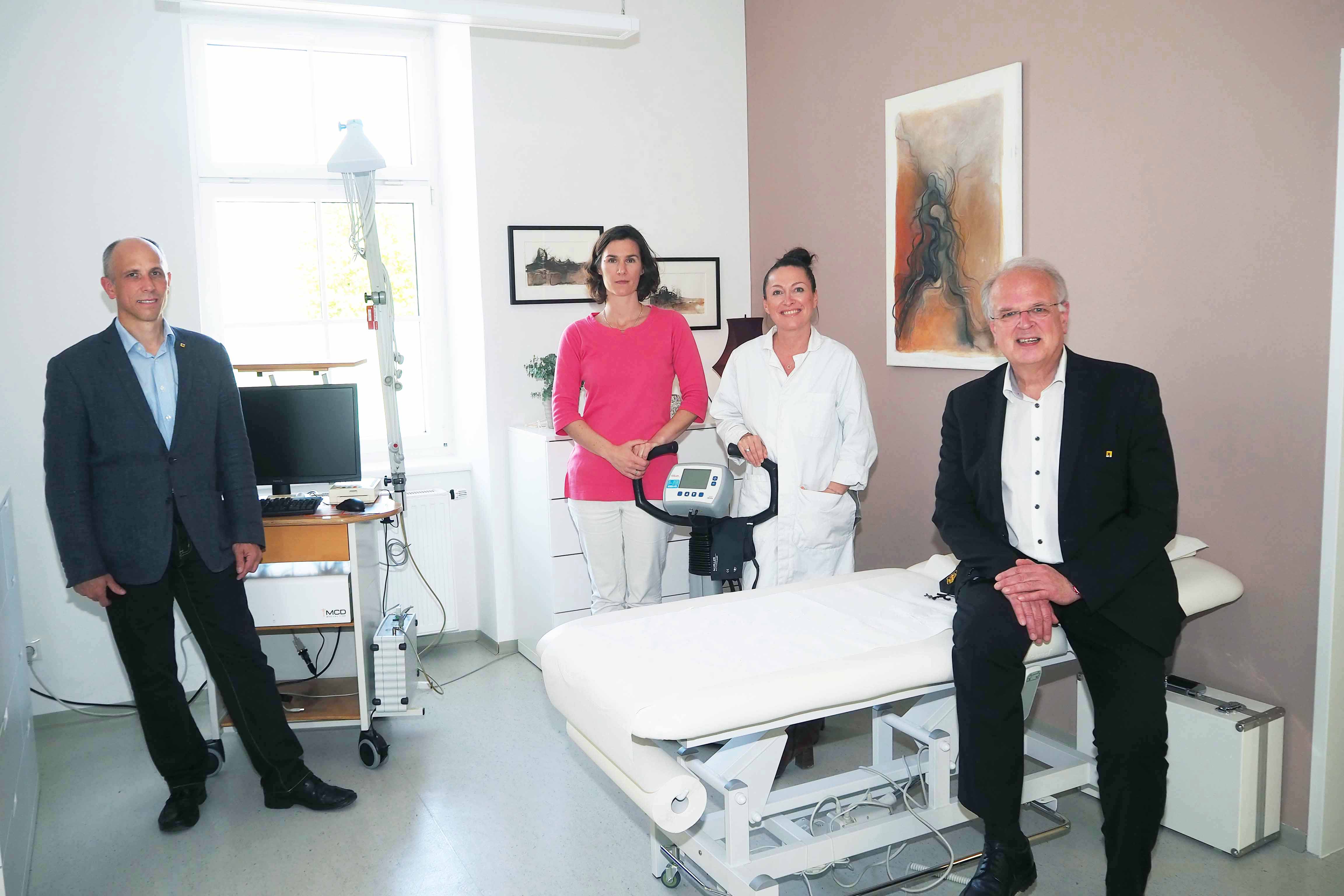 Foto: Willkommensbesuch: Mag. Hannes Zimmermann, Ordinationsassistentin Michaela Spies, Dr. Julia Hannreich und Bürgemeister Dr. Reinhard Resch (von links); © Stadt Krems,