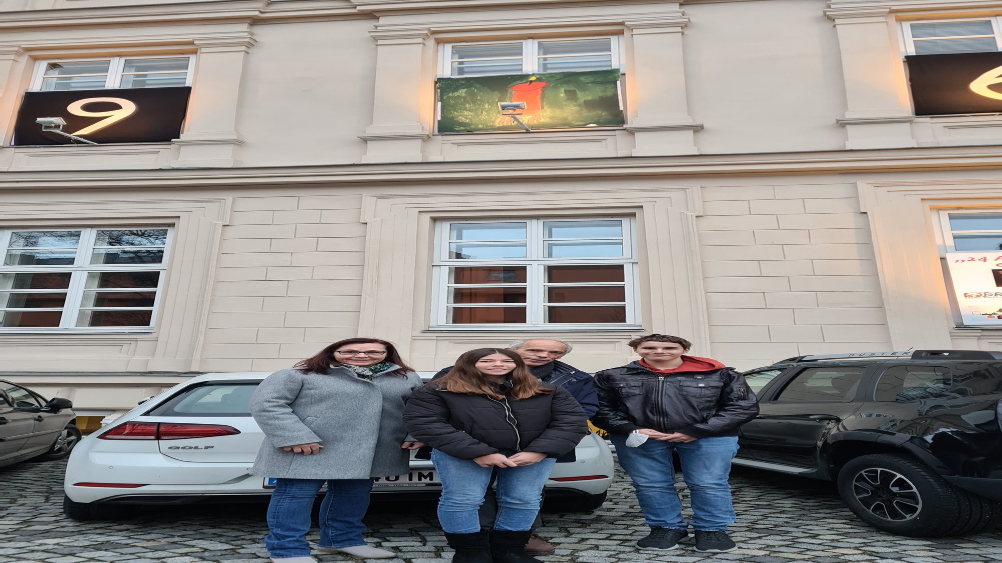 Foto 2: Mag. Elisabeth Buchinger-Glaser (Direktorin BRG Ringstraße, links), Projektkoordinator Mag. Bär mit SchülerInnen vor dem Schulgebäude