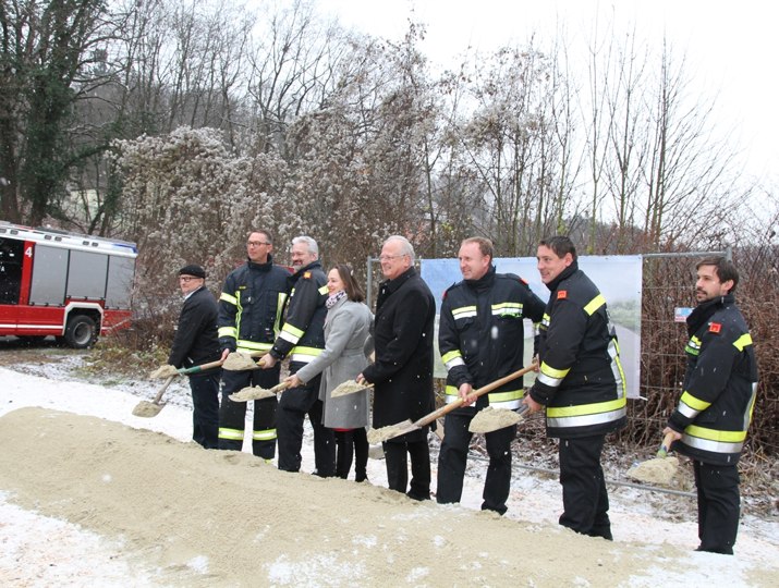 Foto: Spatenstich mit Franz Sam, Feuerwehr-Bezirkskommandant Martin Boyer, FF-Kommandant Gerhard Urschler, Bundesrätin Doris Berger-Grabner, Bürgermeister Dr. Reinhard Resch und Vertretern der Feuerwachen Krems-Süd. © Stadt Krems, Abdruck bei Namensnennung honorarfrei.