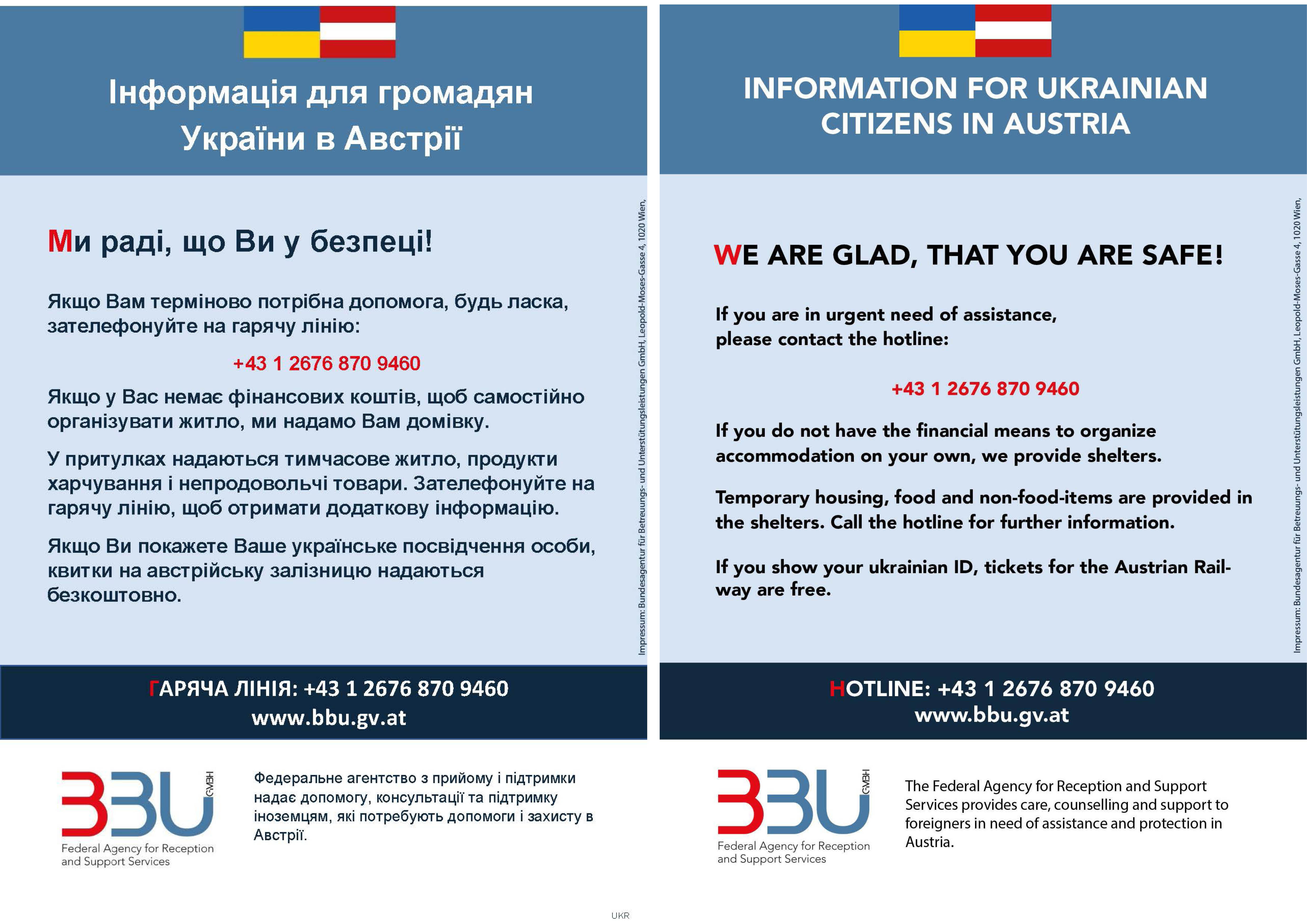 - Informationen für geflüchtete Menschen aus der Ukraine: +43 1 2676 870 9460. Weitere Information für ukrainische BürgerInnen: www.bbu.gv.at/ukraine.